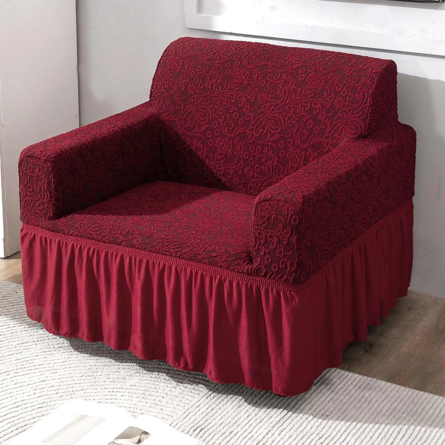 Elastic Stretchable Designer Woven Jacquard Sofa Cover with Frill, Wine Red