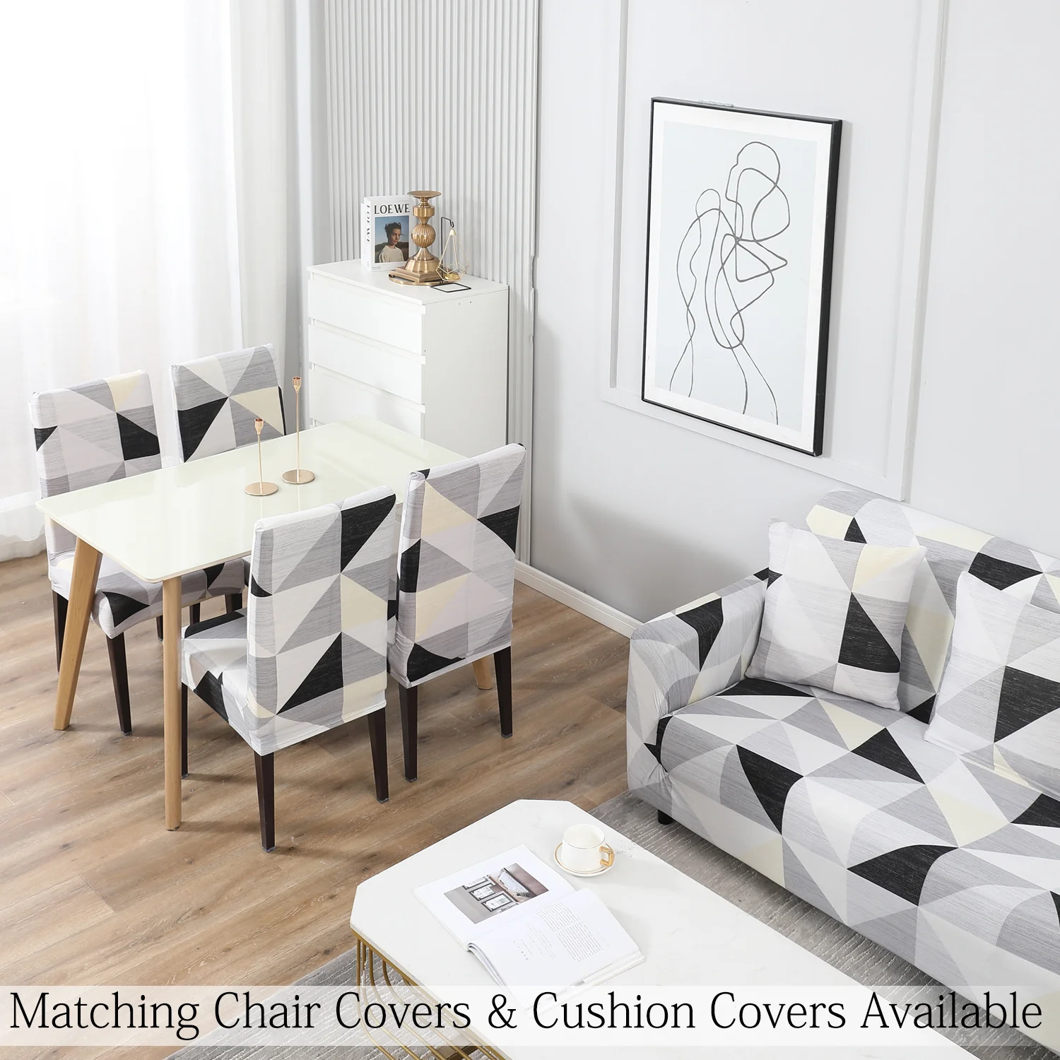 Elastic Stretchable Printed Sofa Cover, Black Grey Geometric
